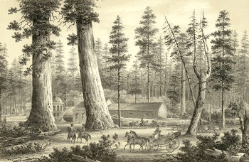 Left: Title page engraving by Edward Vischer, "The Mammoth Tree Grove," 1862. The Mammoth Tree Grove is located in Calaveras County, California. In 1852 it became the first big tree grove to be "discovered" by Europeans and ever since has been a major tourist attraction. It was protected in 1931 with the founding of the Calaveras Big Tree State Park. |