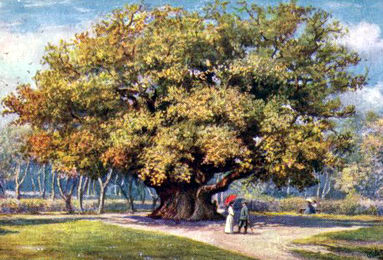 An English example of a famous individual tree is the "Major Oak" of Sherwood Forest (left), a 1,000 year old oak named for Major Hayman Rooke, who first described and illustrated the tree in 1790. At the time, its massive trunk was recorded as 34 ft 4 in circumference. In the Domesday Book of 1086 the Sherwood Forest was noted as a royal hunting grounds that covered most of Nottinghamshire. During this time, ancient trees were believed to be a medium of prophecy and knowledge and the home of woodland spirits. Today Sherwood Forest is a remnant of 165 sq miles (423 sq km), part of which is protected as a National Nature Reserve. Of its surviving big trees, Major Oak is the most famous as the legendary place of shelter for Robin Hood. To keep it from collapsing, supports hold up its branches. |