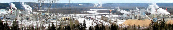 Huge piles of logs and wood chips used by Intercontinental Pulp, Northwood Pulp, and Prince George Pulp & Paper