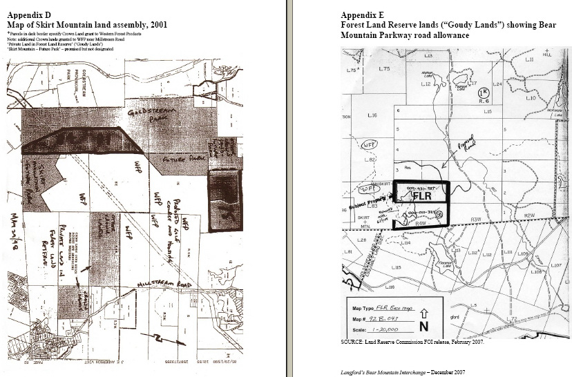 The public does not yet fully understand how their beloved Goldstream Park has been negatively impacted by the self serving back room dealing of local politicians, sleazy logging companies and development "cowboys." In a shocking act of profiteering, 243 acres of publicly owned (Crown) land originally slated for Goldstream Provincial Park was virtually given to the Bear Mt Resort developers without public disclosure or open tendering. Furthermore, 35 acres of land in the Goldstream Watershed were removed from the Forest Land Reserve, and 180 acres were sold by Langford councillor John Goudy for subdivision.