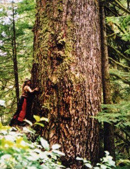 The record sized Douglas fir "Big Betty" (left), discovered by Ingmar Lee in 2003 grows in the Upper Walbran, an ancient forest remnant on Vancouver Island that is being clearcut logged. Wenzel correctly characterizes such mad acts of nature destruction: "BC is selling part of its soul, the part which belongs to all human beings." |